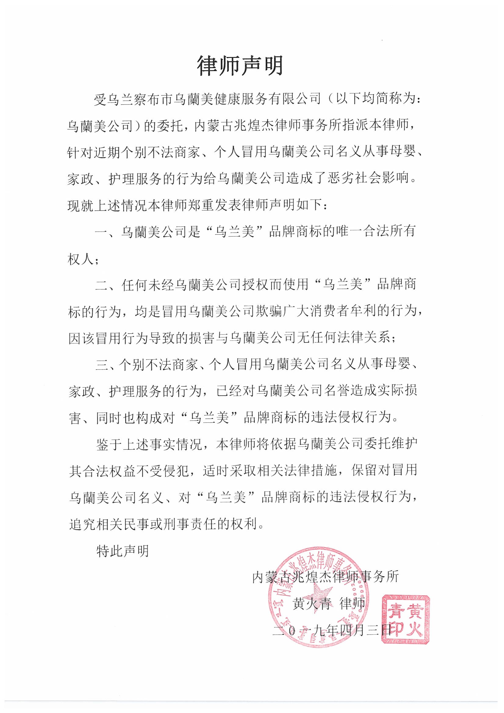 針對近期個別不法商家、個人冒用烏蘭察布市烏蘭美健康服務(wù)有限公司名義從事母嬰、家政、護理服務(wù)的行為,給公司造成了惡劣的社會影響。現(xiàn)公司委托內(nèi)蒙古兆煌杰律師事務(wù)所黃火青律師,發(fā)表律師聲明如下: