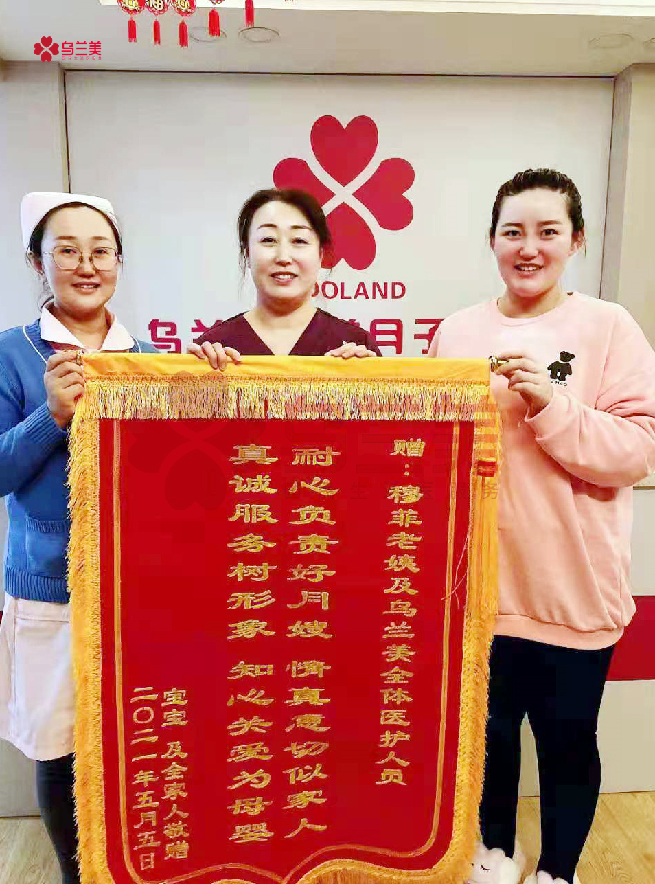 5月5日一大早,烏蘭美醫(yī)養(yǎng)月子中心的每一位母嬰護(hù)理師和工作人員的臉上,都洋溢著幸福的笑容??蛻粼S娜一家將一面印有“耐心負(fù)責(zé)好月嫂,情真意切似家人,真誠服務(wù)樹形象,知心關(guān)愛為母嬰”的錦旗,親自送到了烏蘭美醫(yī)養(yǎng)月子中心母嬰護(hù)理師穆菲(簡稱,穆姐)手里,以此感謝她對寶媽和寶寶無微不至的關(guān)懷與照護(hù),并對烏蘭美健康集團(tuán)的正規(guī)和專業(yè)表示了認(rèn)可!