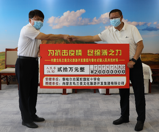 2022年8月15日,內(nèi)蒙古烏蘭美文化旅游開發(fā)集團副總經(jīng)理王利深入我市察右后旗抗疫一線,代表集團向當?shù)丶t十字會捐款20萬元,助力疫情防控工作。察右后旗旗委副書記閆富,旗委常委、宣傳部長鄭珺參加了捐助儀式。